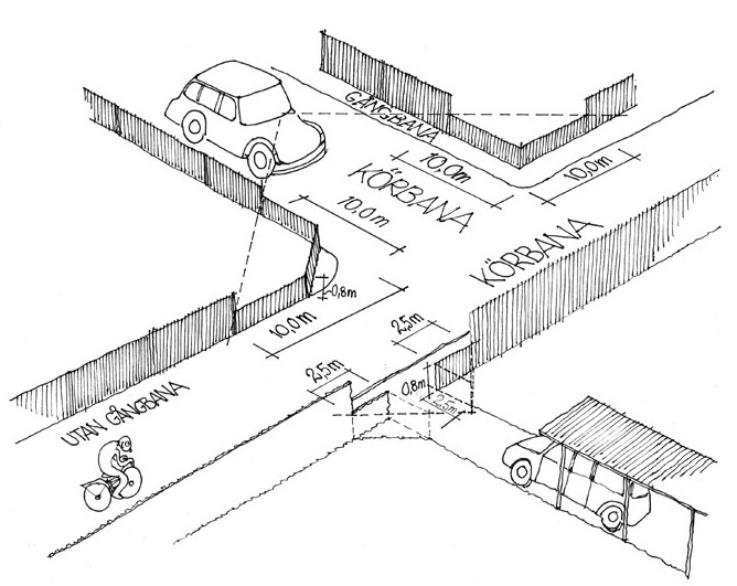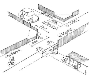 I korsningen inom den så kallade sikt triangeln (se bild enligt nedan) får mur, staket, häck, buskar eller andra skrymmande föremål vara högst 0,8 meter över körbanans innerkant. För att inte hindra framkomligheten för trafikanter, snöröjare eller gaturenhållare får växtlighet på tomt inte skjuta ut över gångbana eller motsvarande på lägre höjd över marken än 4,5 meter, trots vad som står på bilden.